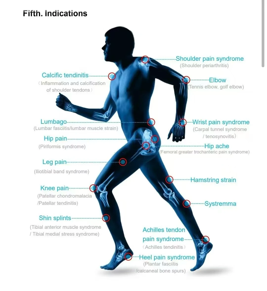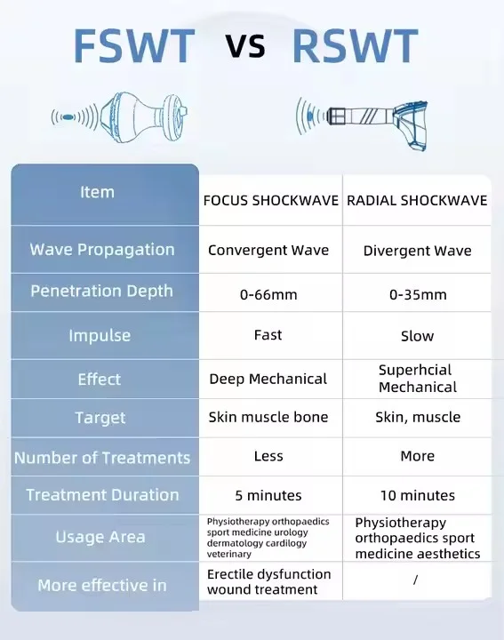 Focus shock wave can provide deeper tissue with more depth penetration than radial waves, focusing its output on more localized and deeper regions. The position of the applicator on the skin is minimally affected, limiting damage to the surface skin and underlying soft tissues (safer and more comfortable).