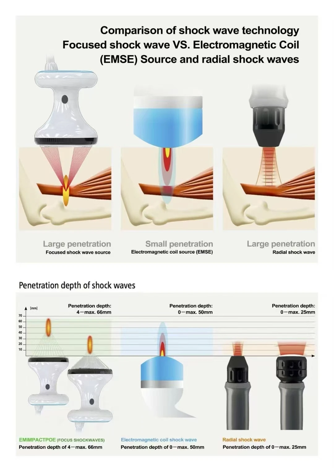 Focus shockwave technology is a newer generation technology. it discharges high-voltage electricity to the electric coil and to forma powerful pulse electromagnetic field energy. The electromagnetic wave generates a deep shock wave in the water. lts advantage is that the output energy is extremely stable, the focal length is long, and the lifespan of the electromagnetic generator is also long-lasting and stable.