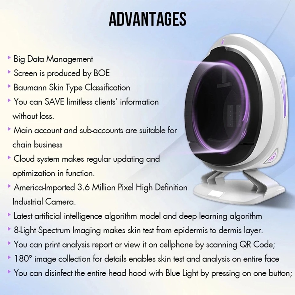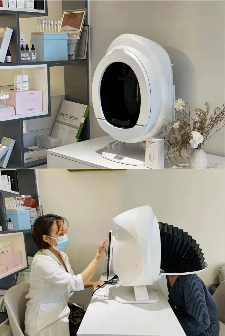 Uses high-resolution cameras to capture skin conditions such as wrinkles, pigmentation, pores, moisture levels, and sebaceous gland activity.