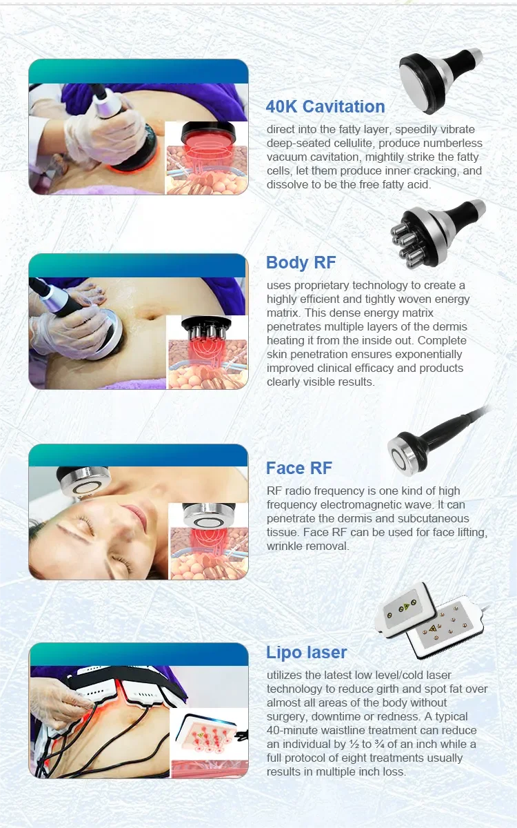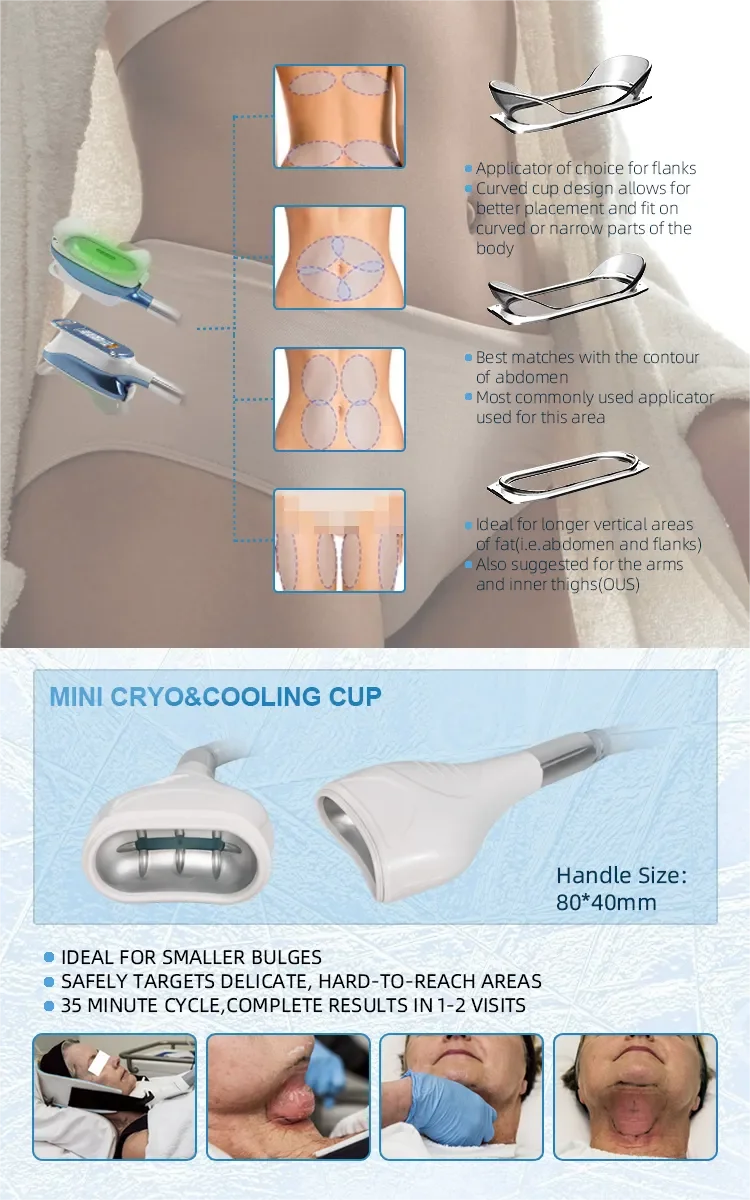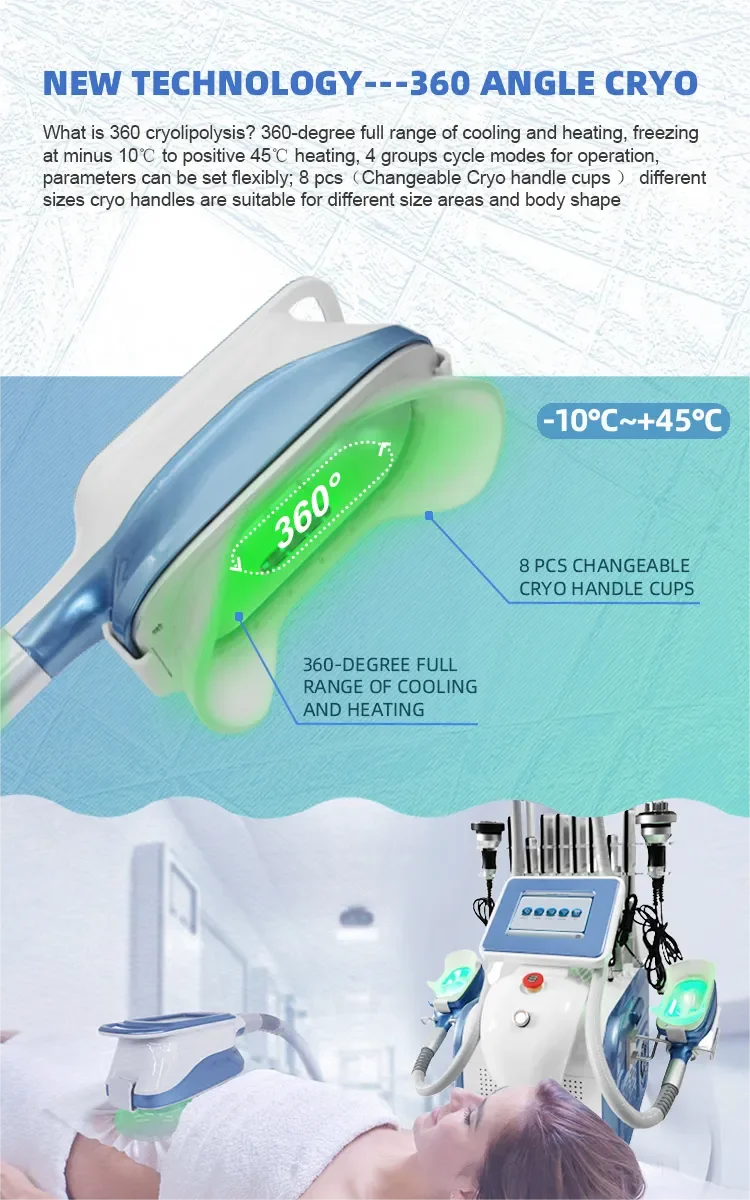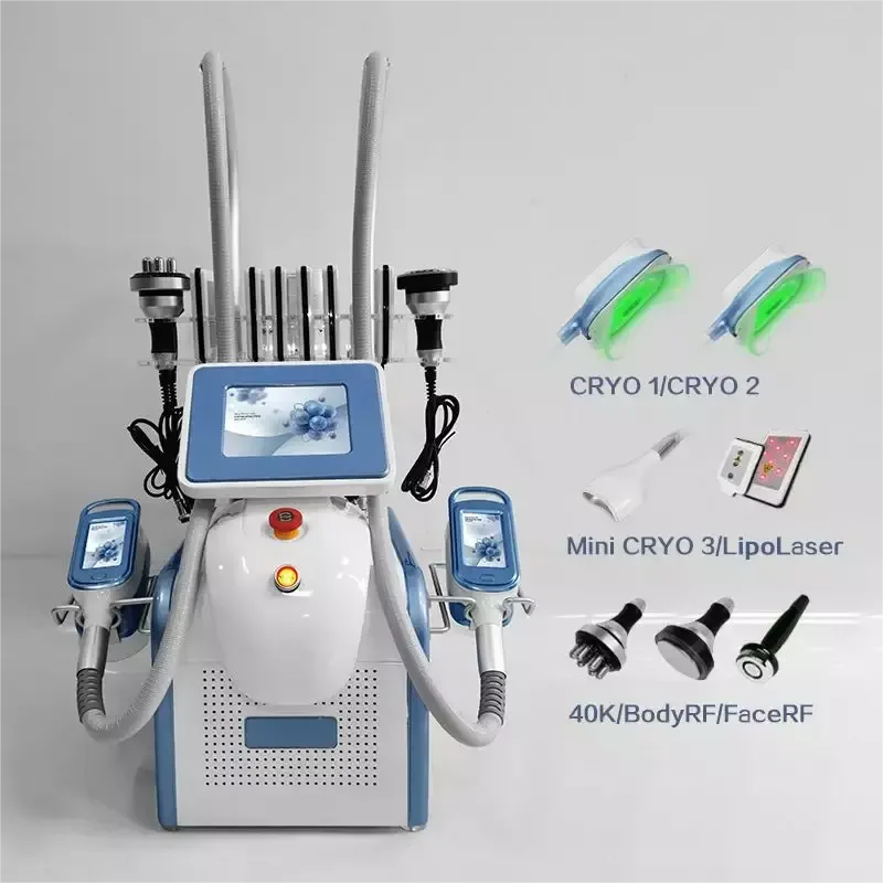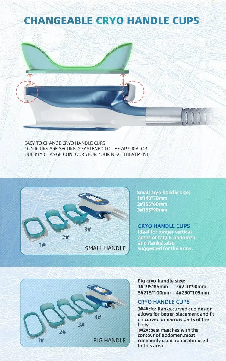 Rated power:800W Handle control method: Touch Screen size: 8.0 inch Handle screen size: 4.5 Handle material: Silicon Handle temperature: -10°C - +45°C Pressure output: 0.08MPa Refrigeration method: Water Cycle RF face: 3MHZ RF frequency: 5MHz Large cryo handle size: 4#230*80mm 1#180*70mm 2#200*70mm 3#210*80mm Small cryo handle size: 3#155*70mm 1#135*60mm 2#145*70mm Double chin handle size: 80*45mm Cavitation head frequency: 40KHz Laser Power: 100mw/pcs Laser wavelength: 650nm Number of laser lights: 72PCS