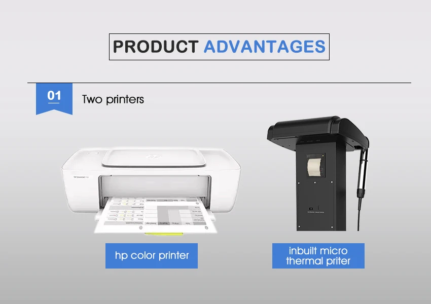4 Two Printers: Inbuilt micro thermal printer and HP Color printer included at no charge. The thermal printer works speedily and conveniently and offers optional A4 size color printout.