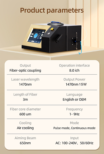 The semiconductor laser therapy device uses a 1470nm wavelength fiber- coupled laser to treat the needle witha disposable lipolysis fiber,precisely locates excess fat and fat in the body, directly hits the target tissue fat cells and rapidly dissolves and liquefies, The instrument mainly acts on deep fat and superficial fat, and transfers theenergy directly to the fat cells for unif- orm heating, During the heating process, the connective tissue and fat cell- structure can be changed by controling the heat, and the adipose tissue has a photothermal effect (so that thefat is dissolvedl), And the photodynamic effect (separating the fat cells from the nomal tissue)decomposes thefat cells to make them evenly liquefied, and the fat liquid is excreted through the ultra-fine positioning needle,which fundamentally reduces the number of fat cells,effectively awoids postoperative rebound.